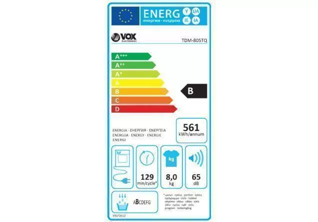 Model VOX TDM-805TQ Način sušenja veša Kondenzaciono Tip Samostojeća Energetska klasa B Kapacitet sušenja 8 kg Klasa sušenja B Nivo buke 65 dB Potrošnja energije Godišnje: 561 kWh Programi Ekstar suv pamuk, pamučni eko kabinet, pamučno peglanje, sintetički kabinet, sintetičko peglanje, delikatno, mešavina, nega bebi odeće, košulje 12 minuta, brzo 29 minuta, osvežavanje, sušenje 10 minuta, sušenje 30 minuta, sušenje 60 minuta i farmerke Displej Da Broj programa 15 Dečija sigurnosna zaštita Sigurnosno zaključavanje Funkcije Indikator ciklusa sušenja